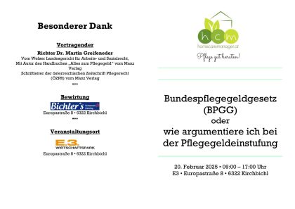 Wir laden Sie herzlich ein zu unserer Veranstaltung „Bundespflegegeldgesetz (BPGG) oder wie argumentiere ich bei der Pflegegeldeinstufung“, bei der wir Ihnen wertvolle Einblicke und praktische Tipps zu diesem wichtigen Thema bieten.
